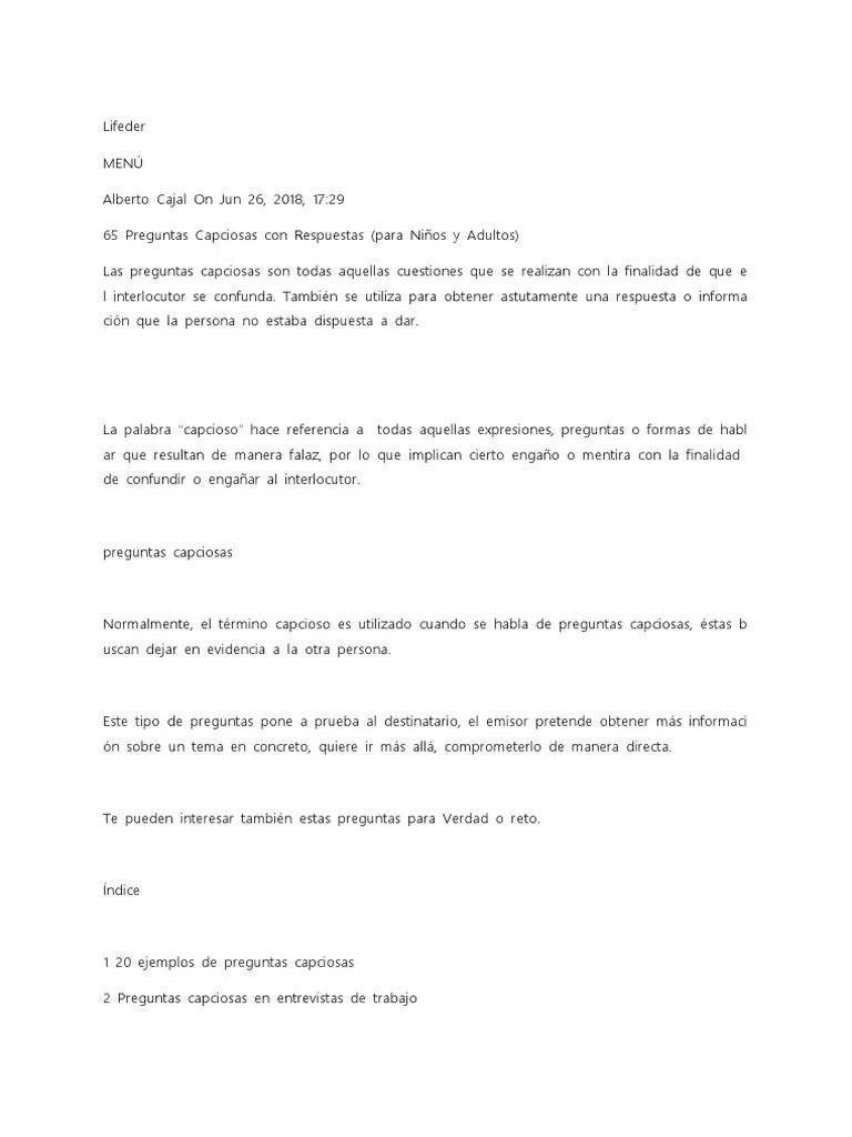 Muchas veces, los errores de razonamiento que cometemos se deben a que nuestro punto de partida es una pregunta capciosa. Una selección de las preguntas capciosas con más trampa para confundir y engañar con trucos a tus amigos, que tendrán que hacer uso de la más pura lógica. Descubre +110 preguntas capciosas con respuestas divertidas y originales. Para responder esta pregunta capciosa no es necesario conocer cuándo les crecen los dientes a los niños ni hacer ningún tipo de cálculo. Entra y descubre las mejores preguntas capciosas que encontrarás en toda la. Ver más ideas sobre acertijos mentales, acertijos, juegos mentales imagenes. Luego, envía algunas de las preguntas más confusas a tus amigos y prepárate para todo tipo de respuestas divertidas. Las preguntas capciosas son todas aquellas cuestiones que se realizan con la finalidad de que el interlocutor se confunda; Encontrar la respuesta a esta pregunta capciosa para adultos . Juegos gratuitos para descargar e imprimir. A menudo se utilizan con humor. Juegos infantiles, juveniles y para adultos. Preguntas difíciles de acertar【para niños y mayores】 con sus respuestas. Lista de preguntas capciosas para poner a prueba tu capacidad de atención, lógica y razonamiento ante cuestiones cuyas respuestas no son las . Si buscas los mejores juegos para adultos y juegos de preguntas . Colección de juegos, retos, penitencias, pruebas.